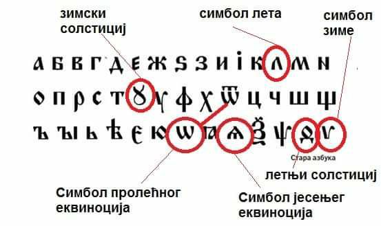 Поново исти поступак имамо за проналажење симбола јесени, тј ако је лето представљено као старо Сунце на самрти, зрела дама лета у дубокој старости, а зима која је тек у најави као мало дете, лето ћемо представити већим симболом од зиме и након што их спојимо долазимо до симбола јесење равнодневице. Овај исти симбол, само стилски уређенији предатавља слово грчког алфабета, односно слово старосрбске и данашње србске ћирилице: СЛОВО А или АЛФА.
